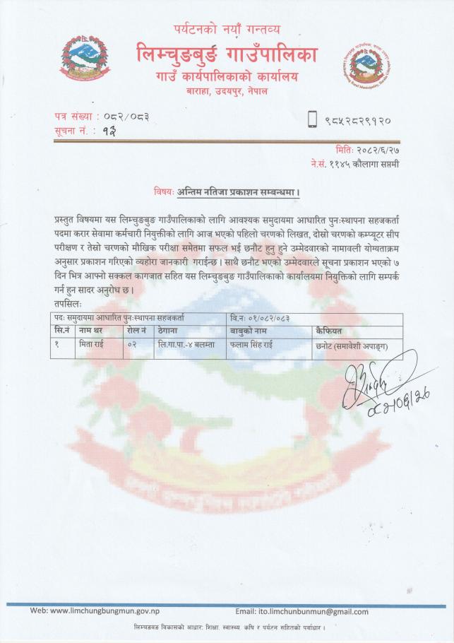 अन्तिम नतिजा प्रकाशन सम्बन्धमा (समुदायमा आधारित पुनः स्थापना सहजकर्ता) ।