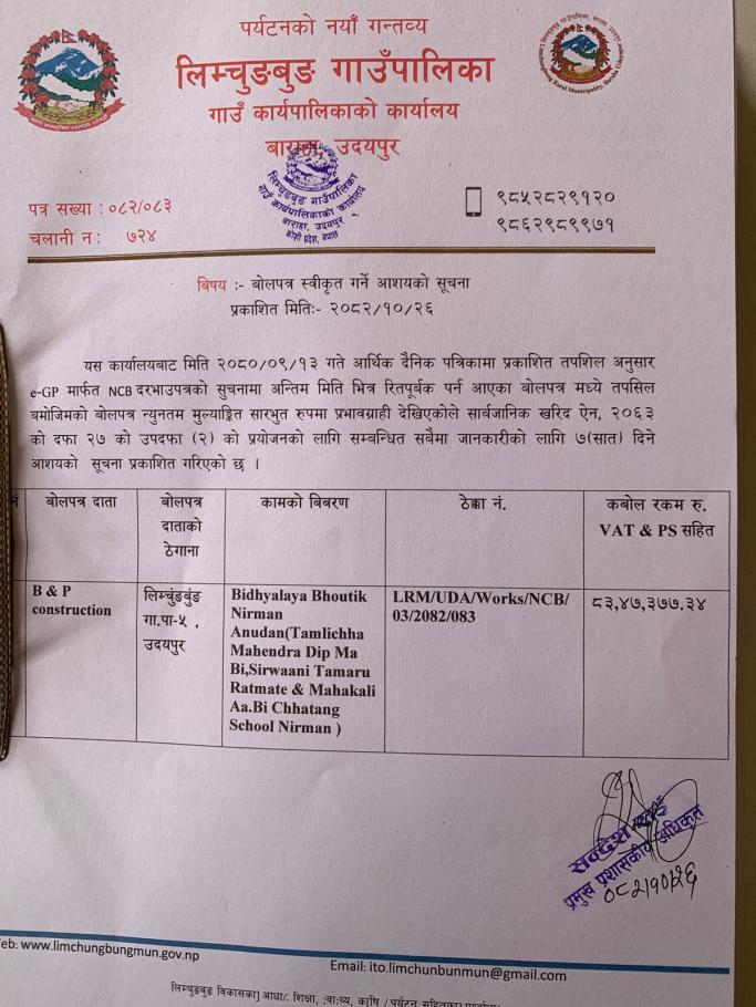 बोलपत्र स्वीकृत गर्ने आशयको सूचना ।
