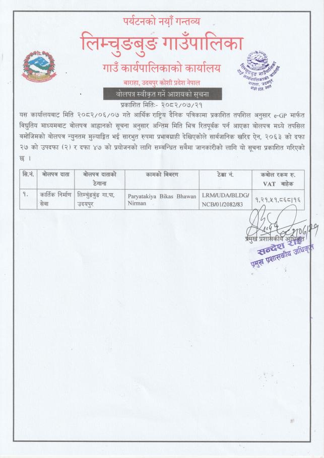 वोलपत्र स्वीकृत गर्ने आशयको सूचना ।