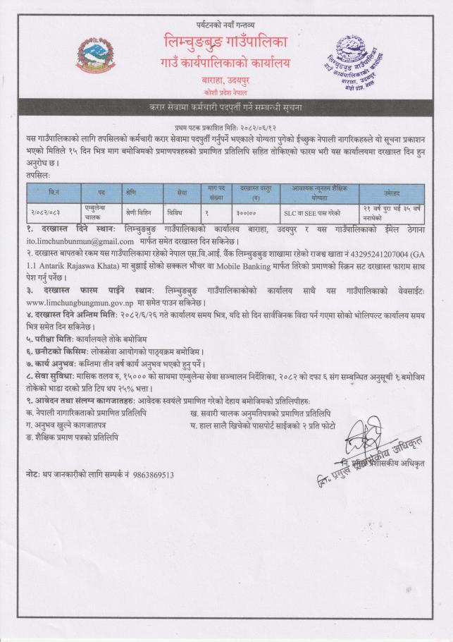 एम्बुलेन्स चालक पदका लागि दरखास्त आह्वान गरिएको सूचना