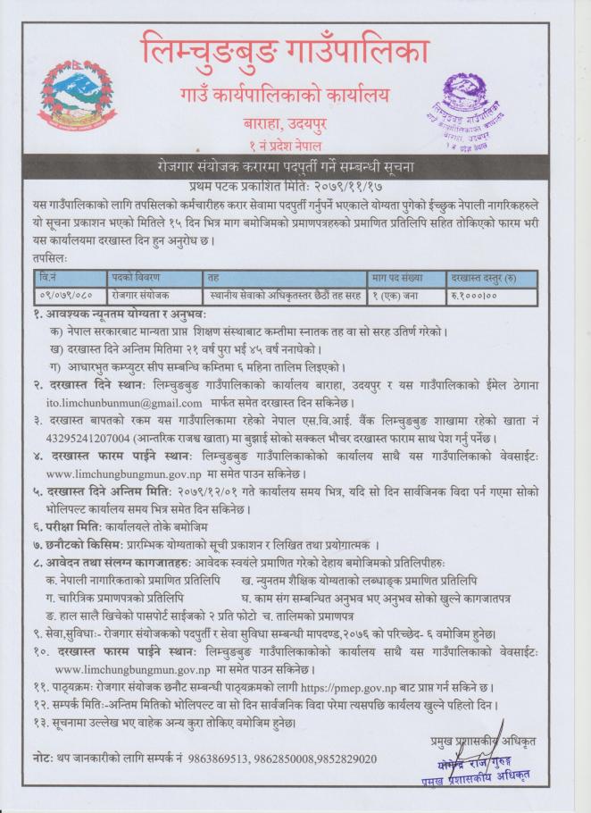 रोजगार संयोजक करारमा पदपुर्ती गर्ने सम्बन्धी सूचना