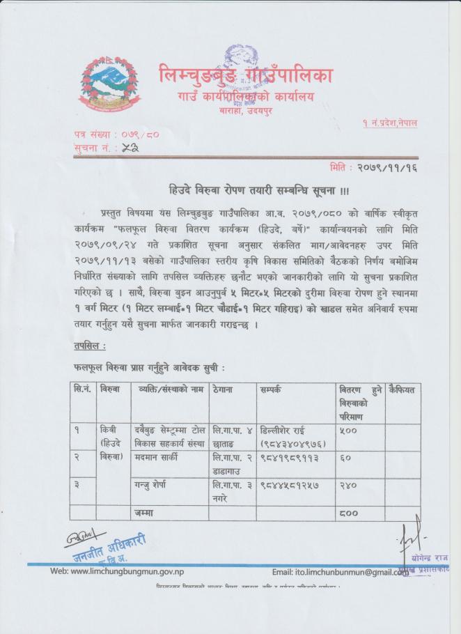 हिउदे विरुवा रोपण तयारी सम्बन्धि सूचना ।