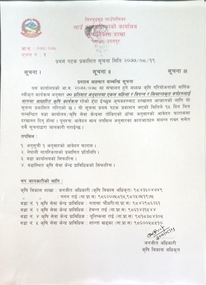 ७० प्रतिशत अनुदानमा एकल महिला र विपन्न र सिमान्तकृत वर्गलाई मागमा आधारित कृषि कार्यक्रमको सूचना